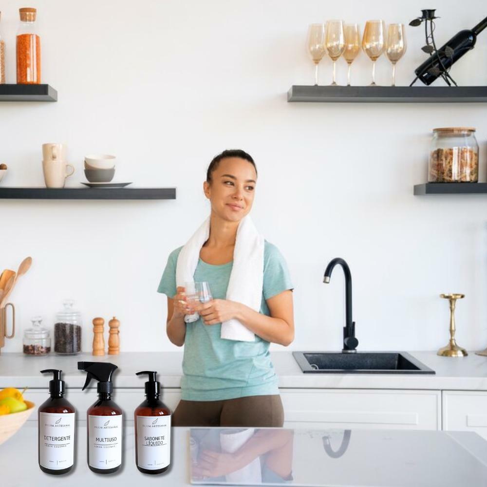 Pensado para quem busca aliar praticidade e estilo, este kit foi desenvolvido para acomodar de maneira impecável suas embalagens de detergente, sabonete líquido e multiuso.